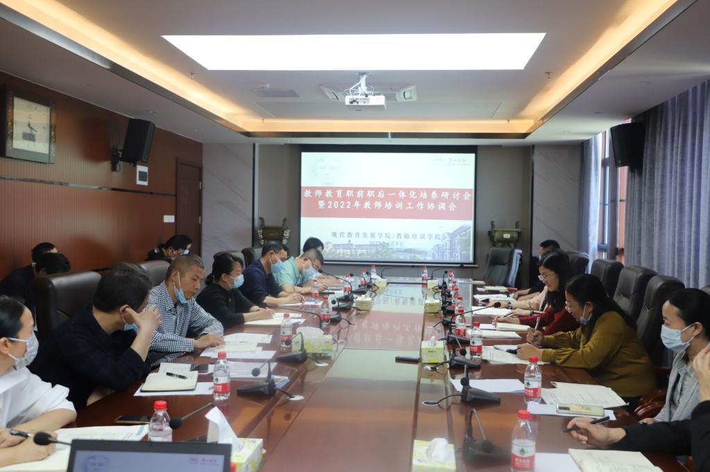 4月9日下午,我校召开教师教育职前职后一体化培养研讨会暨2022年教师培训工作协调会。校党委委员、纪委书记李昱,校党委委员、副校长蒋蓉,财务处、基建与后勤处、保卫处、工会、现代教育技术与网络中心部门负责人,承办教师培训项目的二级学院教师培训工作负责人,现代教育发展学院负责人及相关人员参加会议。会议由现代教育发展学院党委副书记祝娅主持。