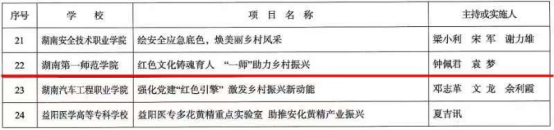 近日,湖南省教育厅揭晓了第七届全省高校精准帮扶典型项目的评选结果,我校钟佩君和袁梦主持的“红色文化铸魂育人,‘一师’助力乡村振兴”项目,荣登湖南省第七届高校精准帮扶优秀典型项目之列。