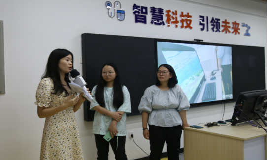 在人工智能实验室,科信组卢霞、吴辉、张露云老师分别从全屋的智能家居体验区、互动未来体验区、人工智能科普教学平台、桌面VR交互一体机四个智能区域向校长们介绍并展示了我校未来学校校园建设的成果。