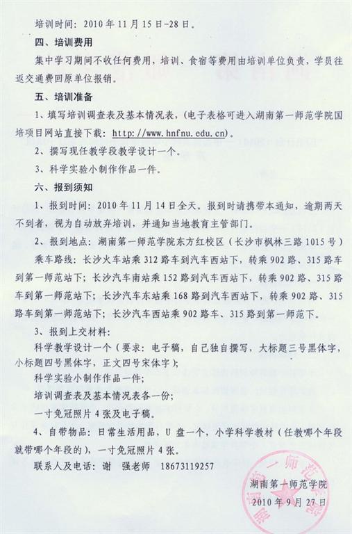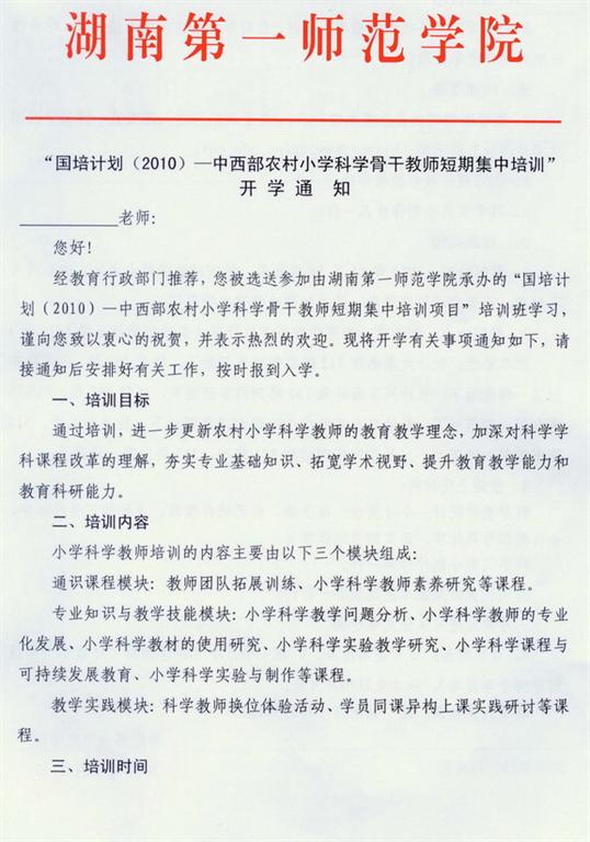 “国培计划(2010)—中西部农村小学科学骨干教师短期集中培训”开学通知