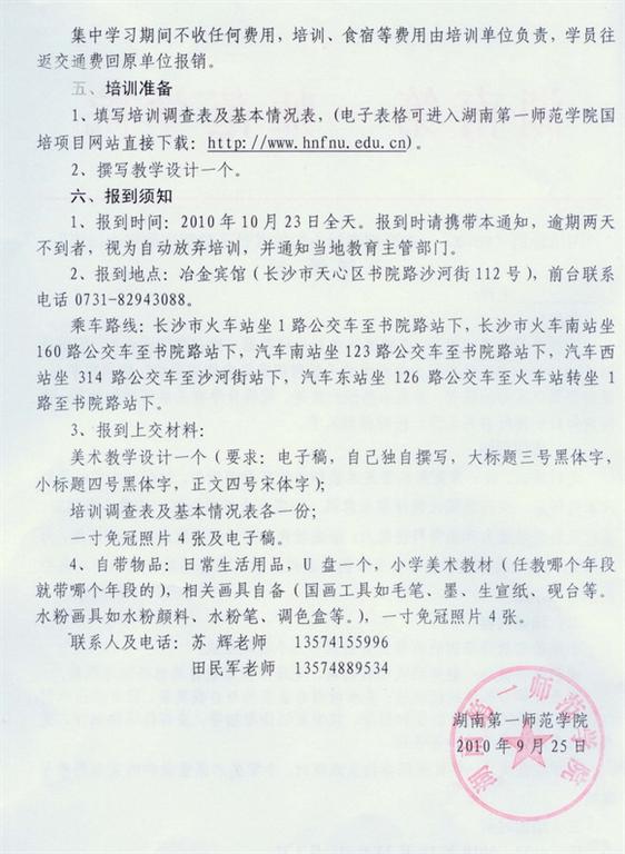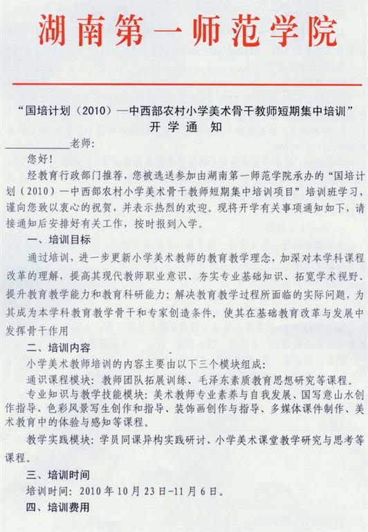 “国培计划(2010)—中西部农村小学美术骨干教师短期集中培训”开学通知