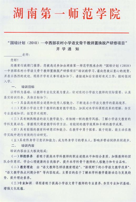 “国培计划(2010)—中西部农村小学美术骨干教师短期集中培训”开学通知