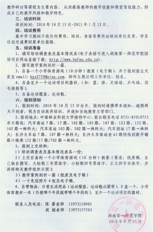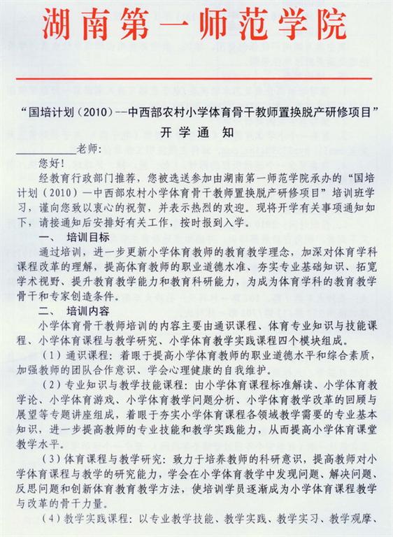 “国培计划(2010)—中西部农村小学体育骨干教师短期集中培训”开学通知