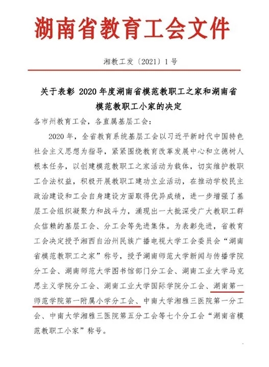 在湖南省教育工会2020年度模范教职工小家创建评选活动中,我校一附小工会被授予“湖南省模范教职工小家”称号。