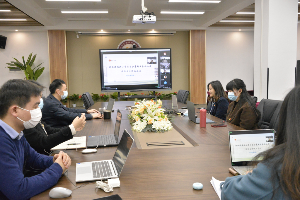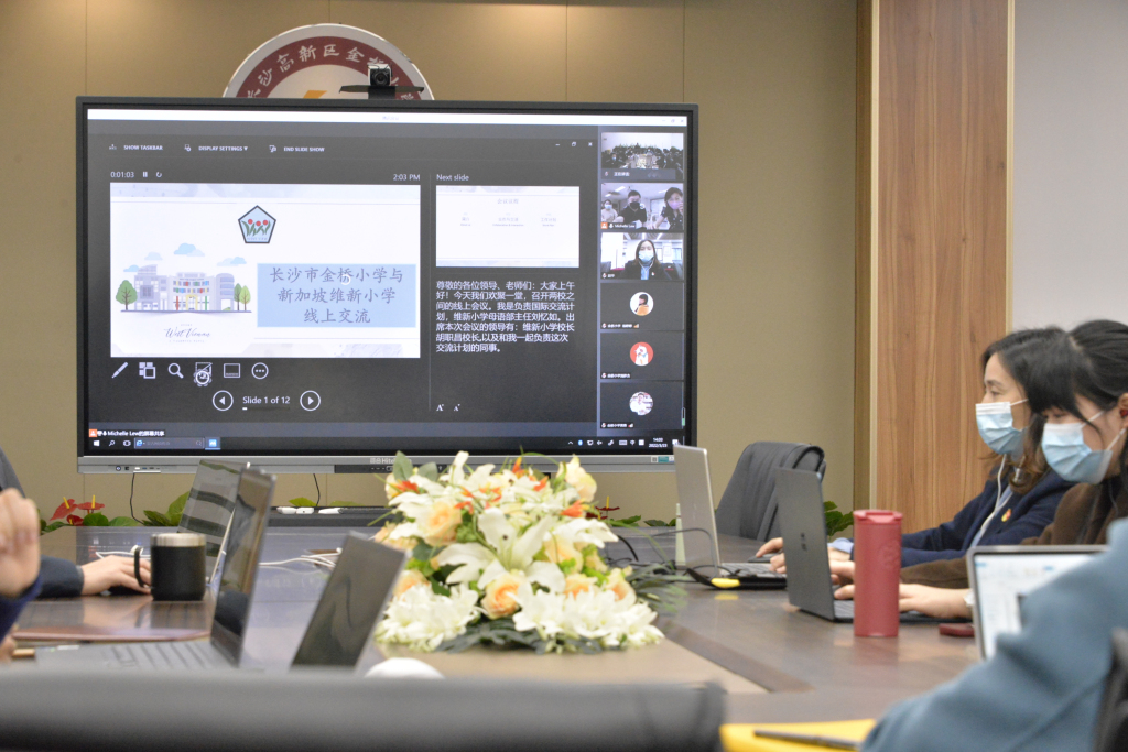 2022年3月23日下午,新加坡维新小学和长沙高新区金桥小学的教师们就两校即将开展的“文化浸润”校际交流活动召开了线上启动仪式。维新小学胡职昌校长、母语部刘忆如主任、金桥小学赵华校长、黄勇书记出席了本次会议。