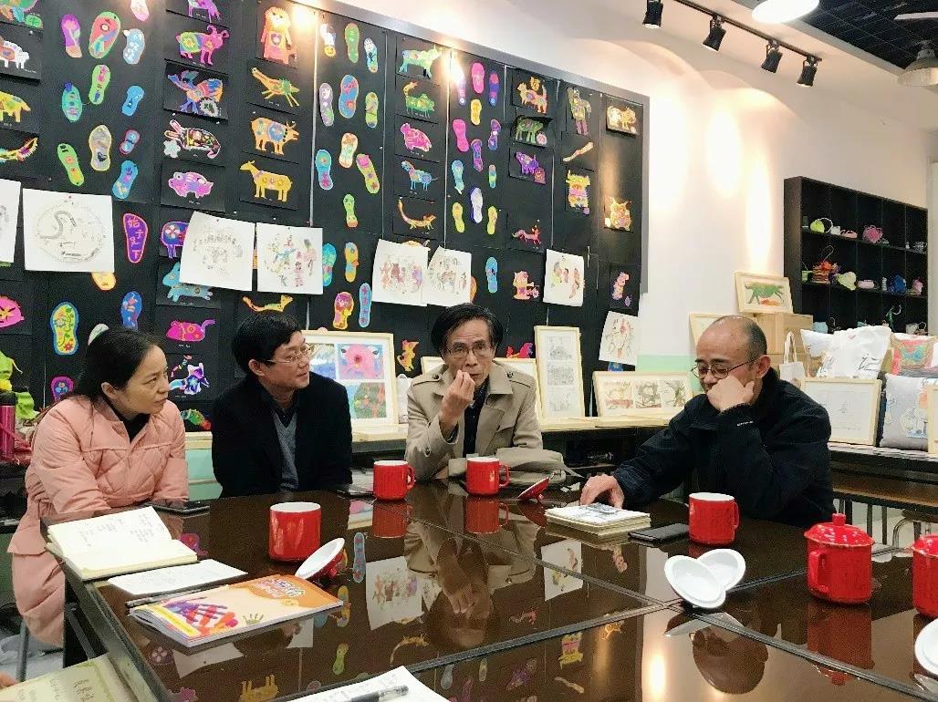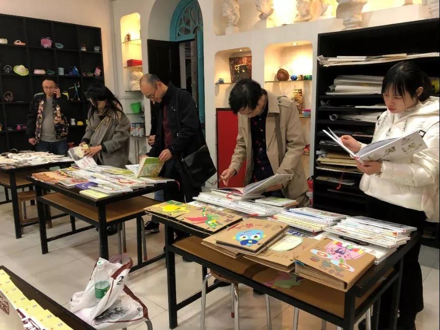 专家们来到儿童作品展示区,饶有兴致地欣赏了孩子们的部分原创绘本手稿、装订成册的原创绘本故事以及根据孩子手稿精心设计的绘本衍生作品,与美术组老师交流绘本教学与绘本创作指导情况,对孩子们充满童真与幻想的绘本作品给予了极高的评价。