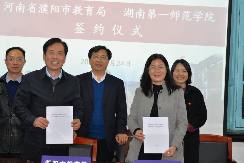 4月24日,我校与河南省濮阳市教育局签署了教育战略合作框架协议。濮阳市教育局党组成员、副局长孙腾海,教师教育科科长王章喜;我校党委委员、副校长蒋蓉,现代教育发展学院院长曾晓洁,副院长李辉华出席签约仪式。