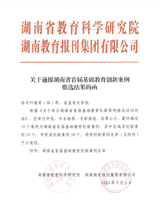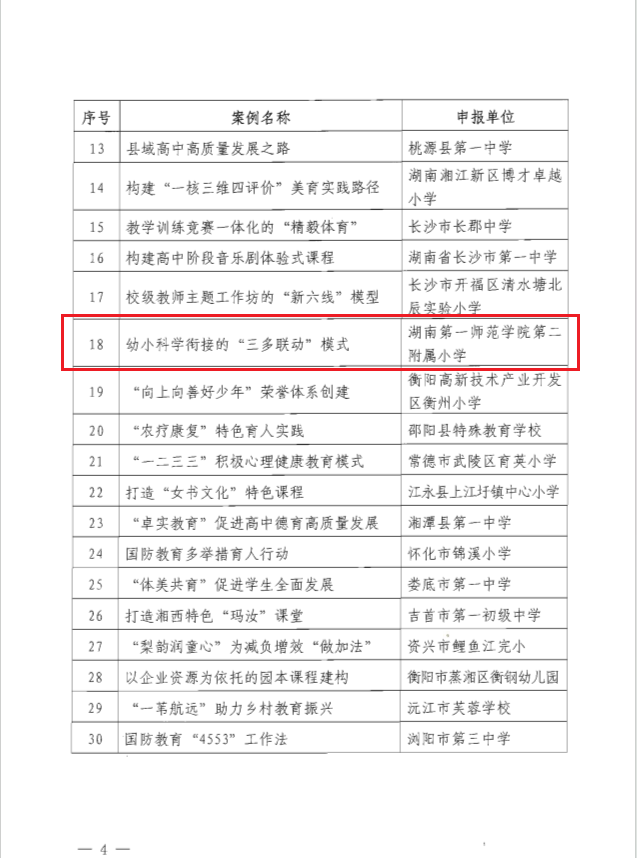 我校二附小教育改革创新案例《幼小科学衔接的“三多联动”模式》获评湖南省首届基础教育创新案例。